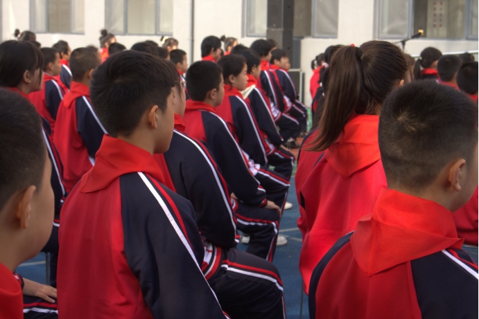 戴着红领巾的小学生们坐在开云kaiyun官方网站爱心学校的操场上 (朱泽雅 摄)