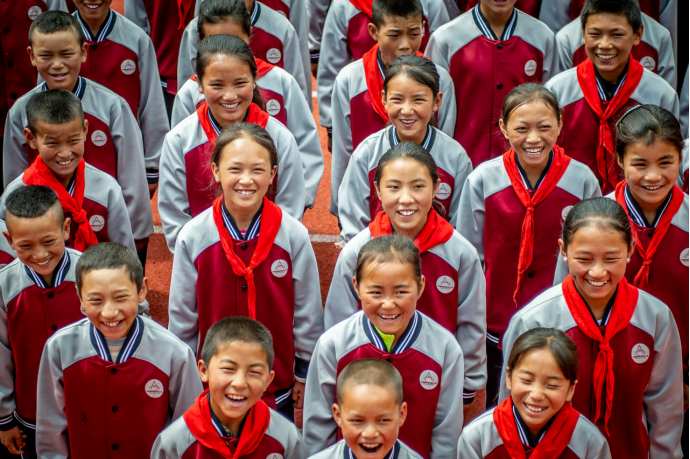 凉山州布拖县阿布泽鲁小学全体学生在开学典礼上穿上了爱心校服