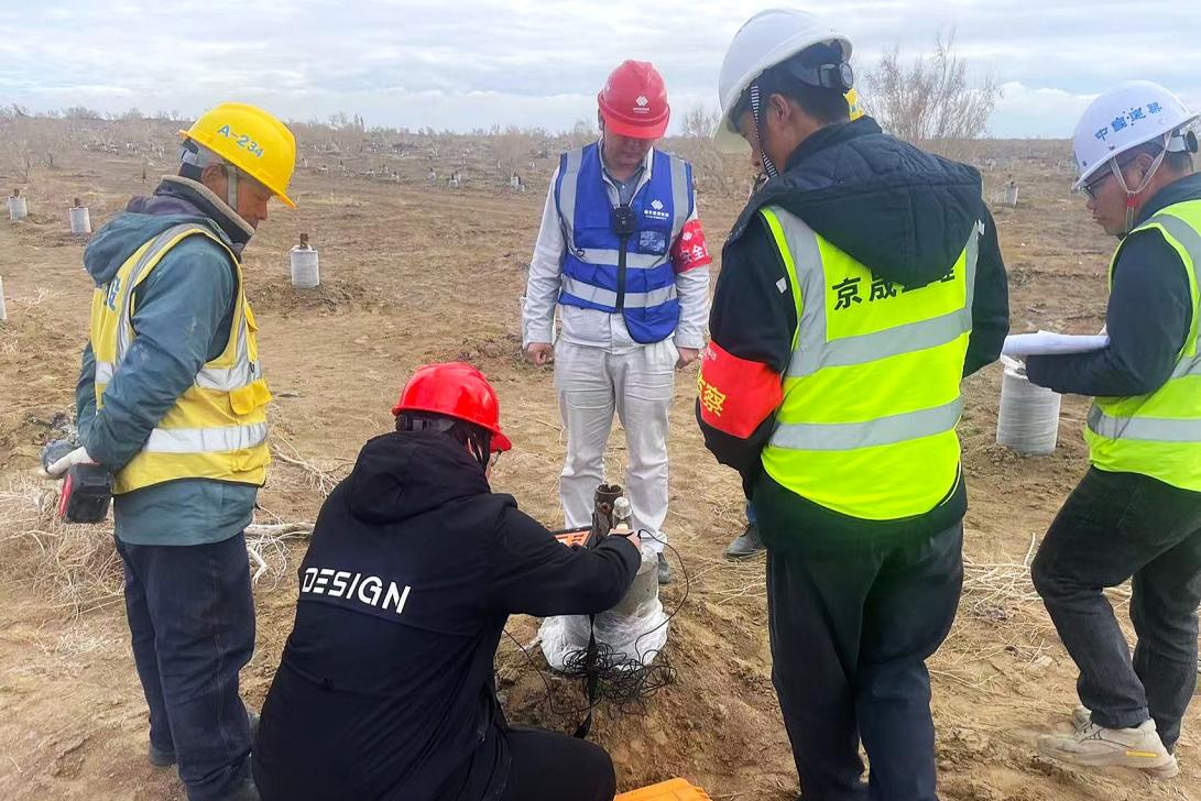 初到戈壁,基地还是一片荒芜。活动板房是宿舍,煤气灶轮番做饭,沙尘暴时常光顾,清晨醒来被褥上总覆着细沙。虽然熟悉电力系统,但光伏施工现场仍有诸多新挑战。他带领团队制定验收标准,严格把控桩基深度、垂直度、混凝土强度等关键指标,为光伏支架安装奠定坚实基础。